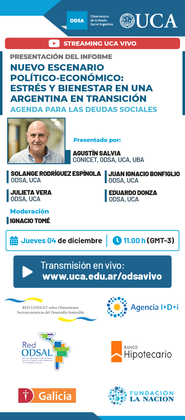 Buenos Aires, diciembre de 2025. El Observatorio de la Deuda Social Argentina de la Universidad Católica Argentina (ODSA-UCA) presentará el jueves 4 de diciembre a las 11 h. el informe “Nuevo escenario político-económico: Estrés y bienestar en una Argentina en transición”, a través del canal de YouTube de la UCA.